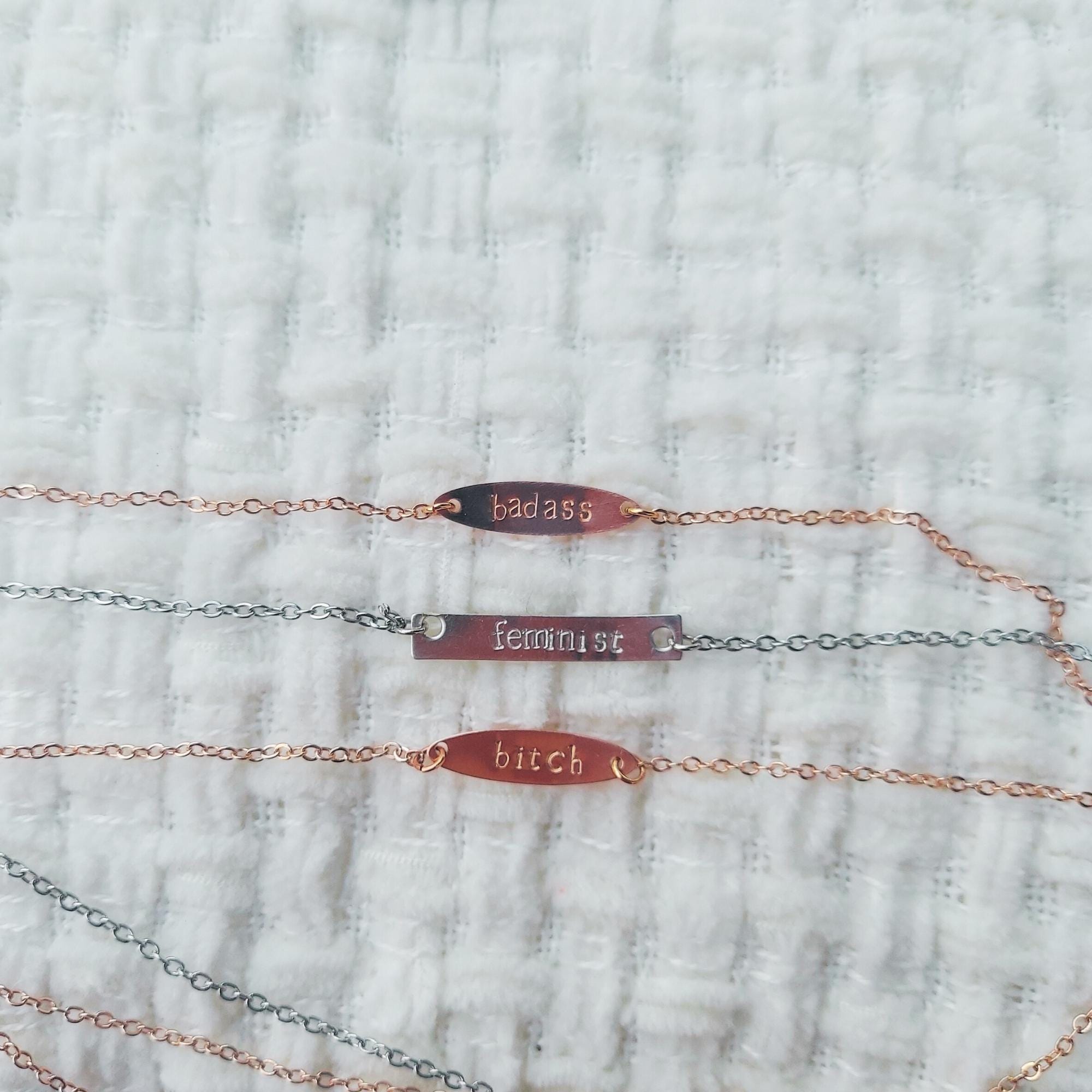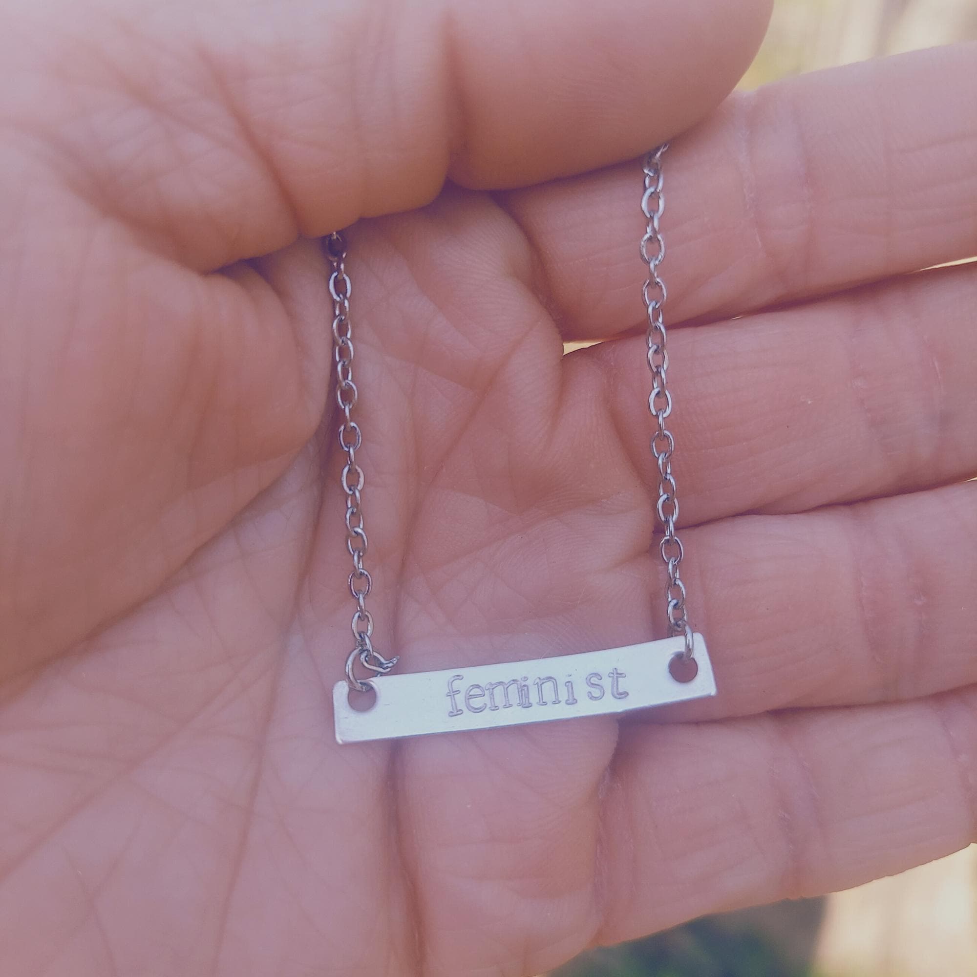 - silver feminist= sterling silver rectangle, hand stamped with "feminist"