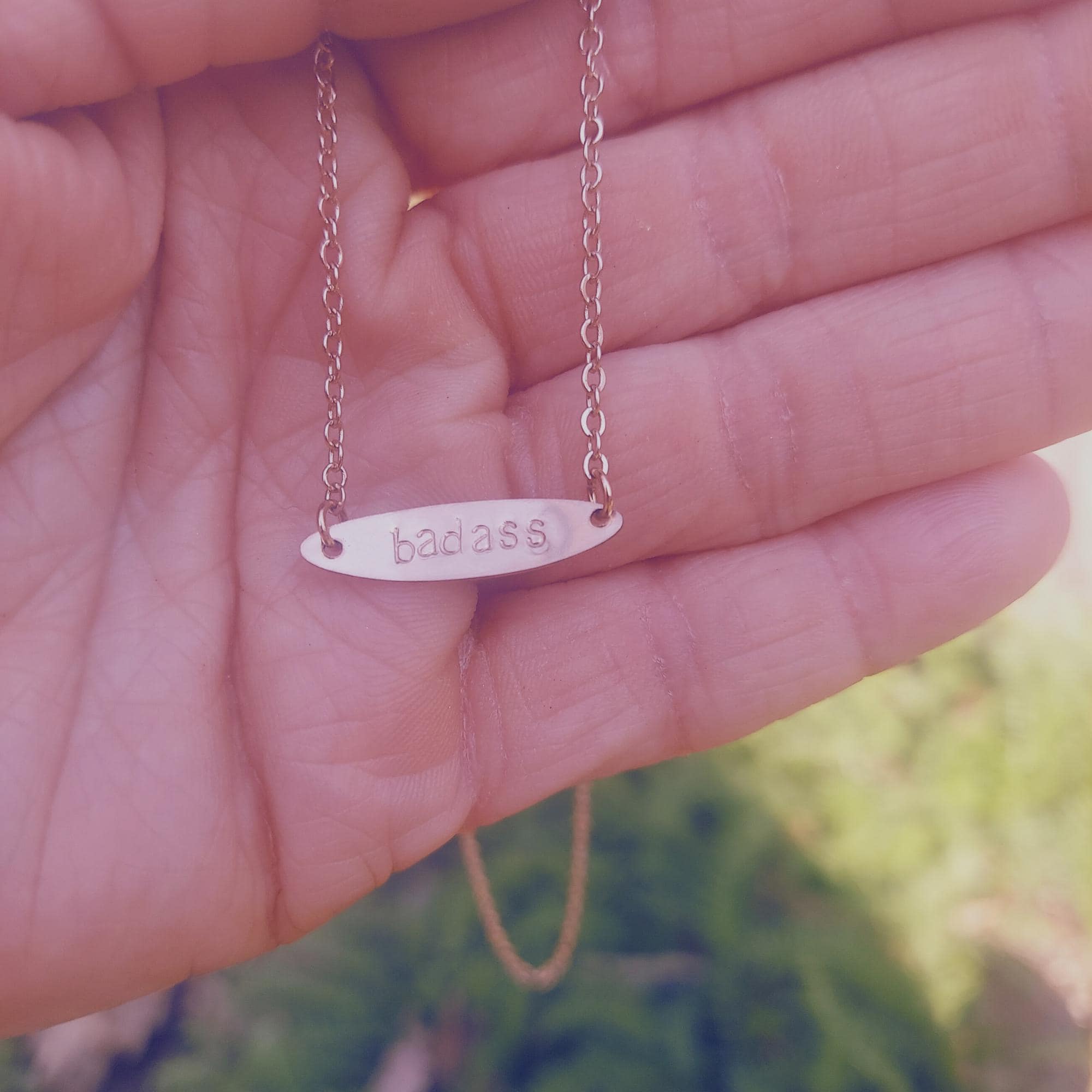 - rose oval badass= rose gold oval, hand stamped with "badass"
