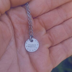 - silver dot cunt= tiny sterling silver disk, hand stamped with "cunt" and dot details around the edge