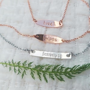 - rose oval bitch= rose gold oval, hand stamped with "bitch"
