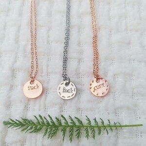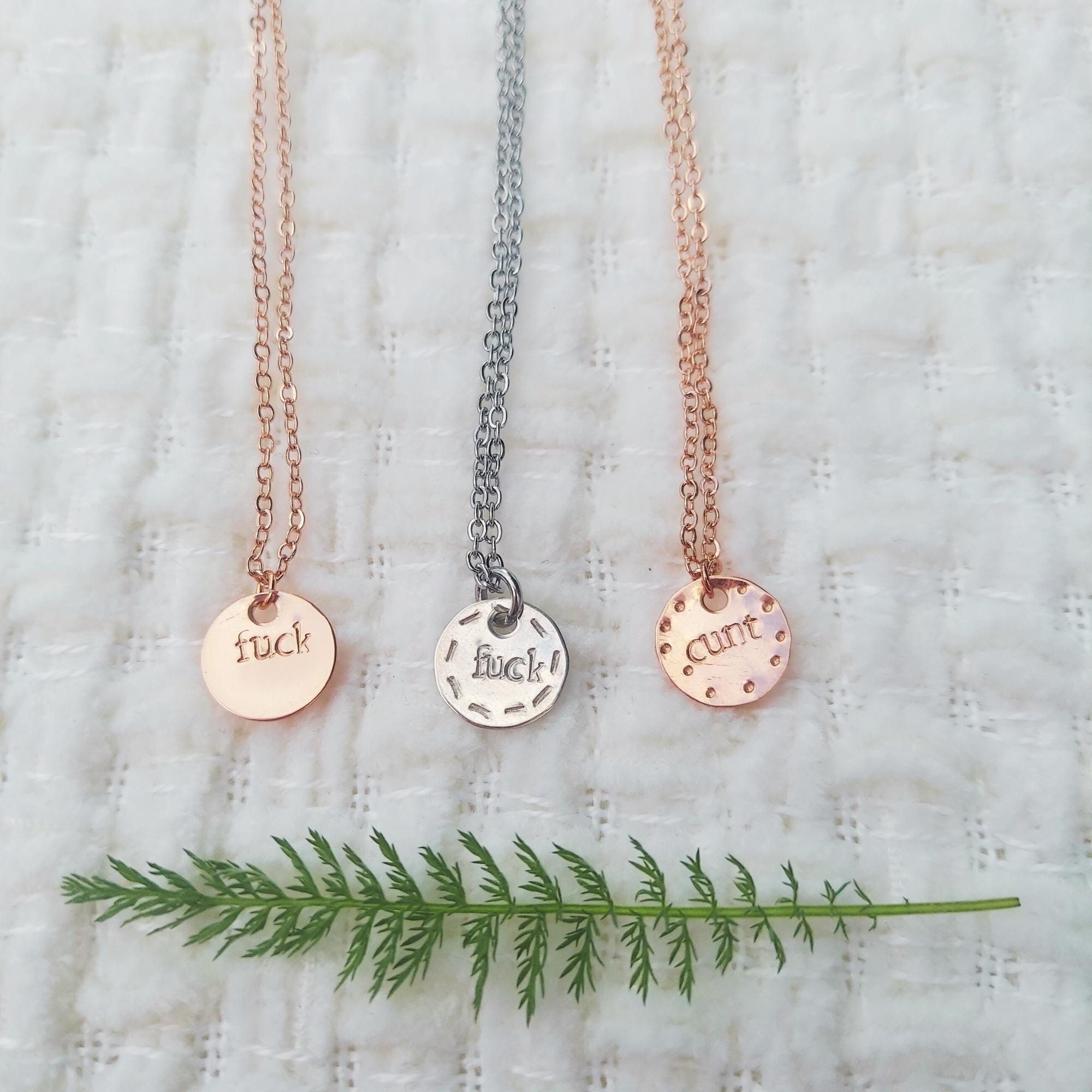 - rose plain fuck= tiny rose gold disk, hand stamped with "fuck"