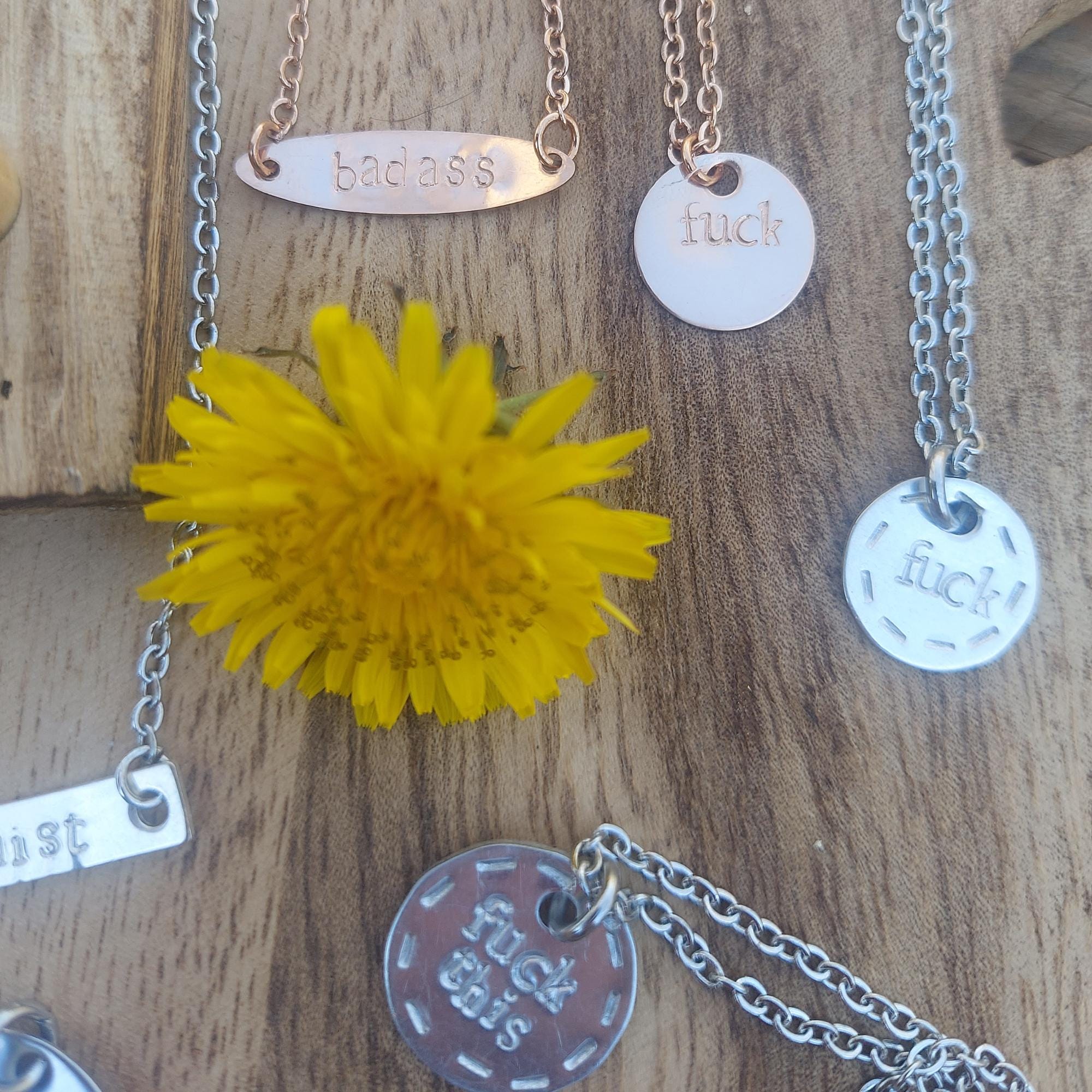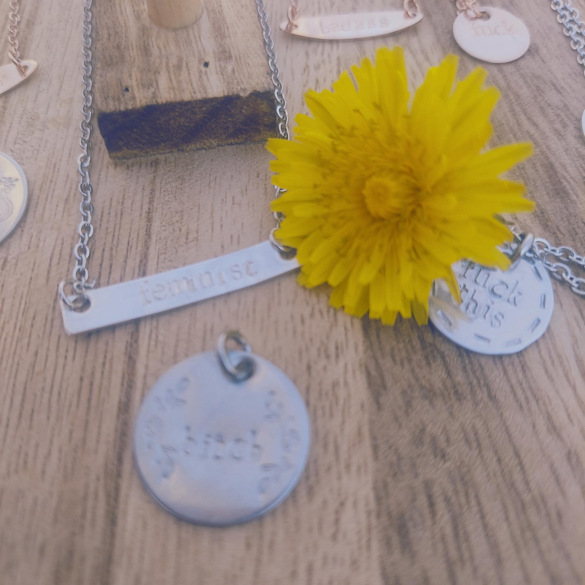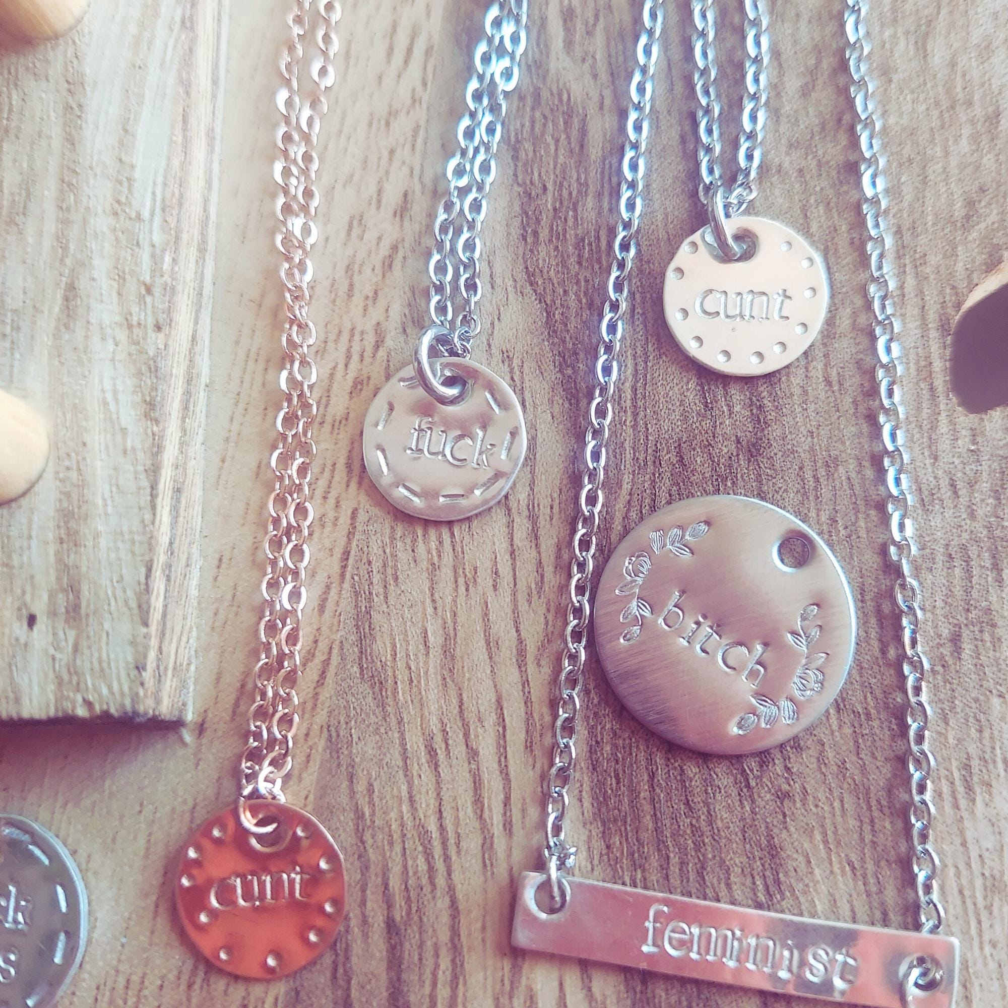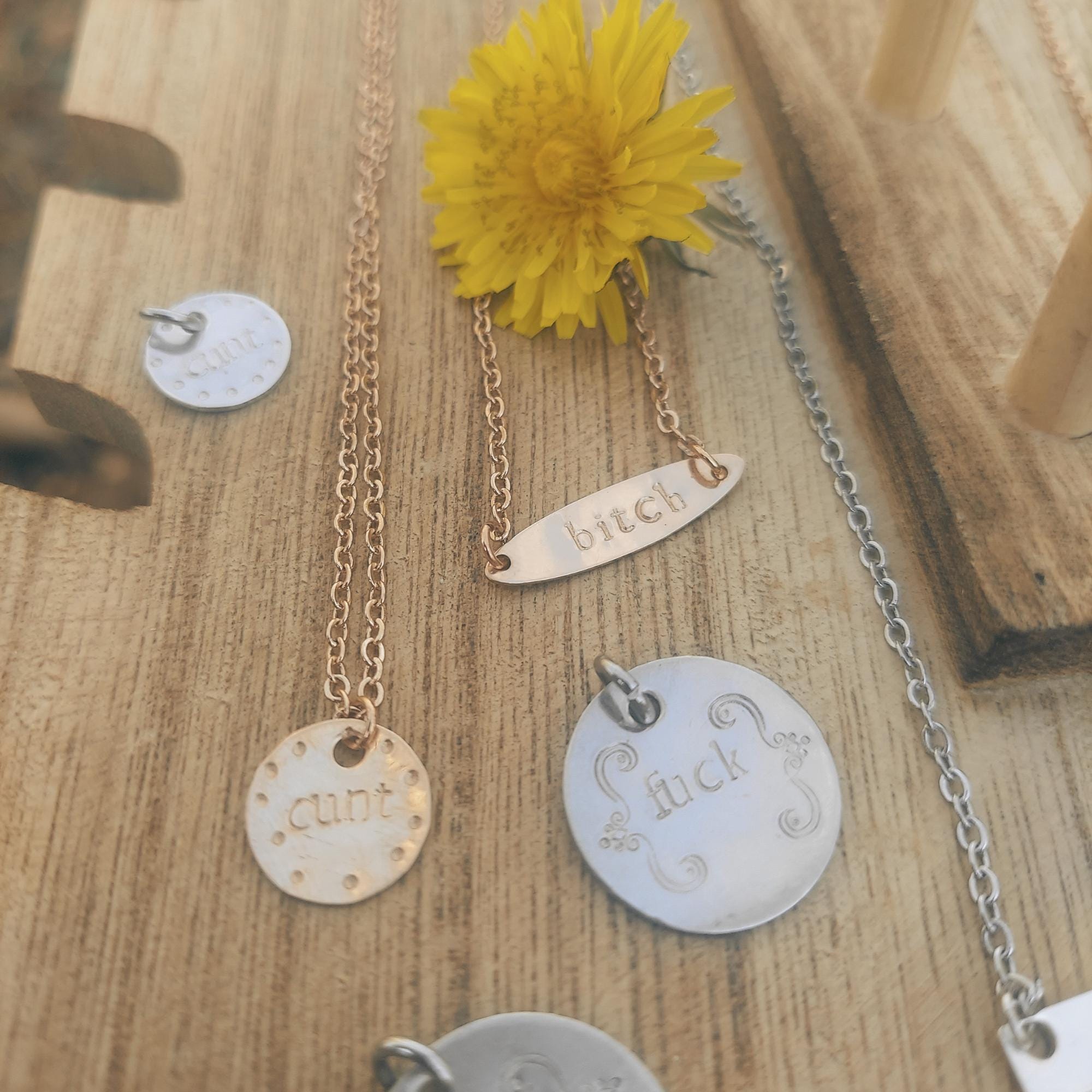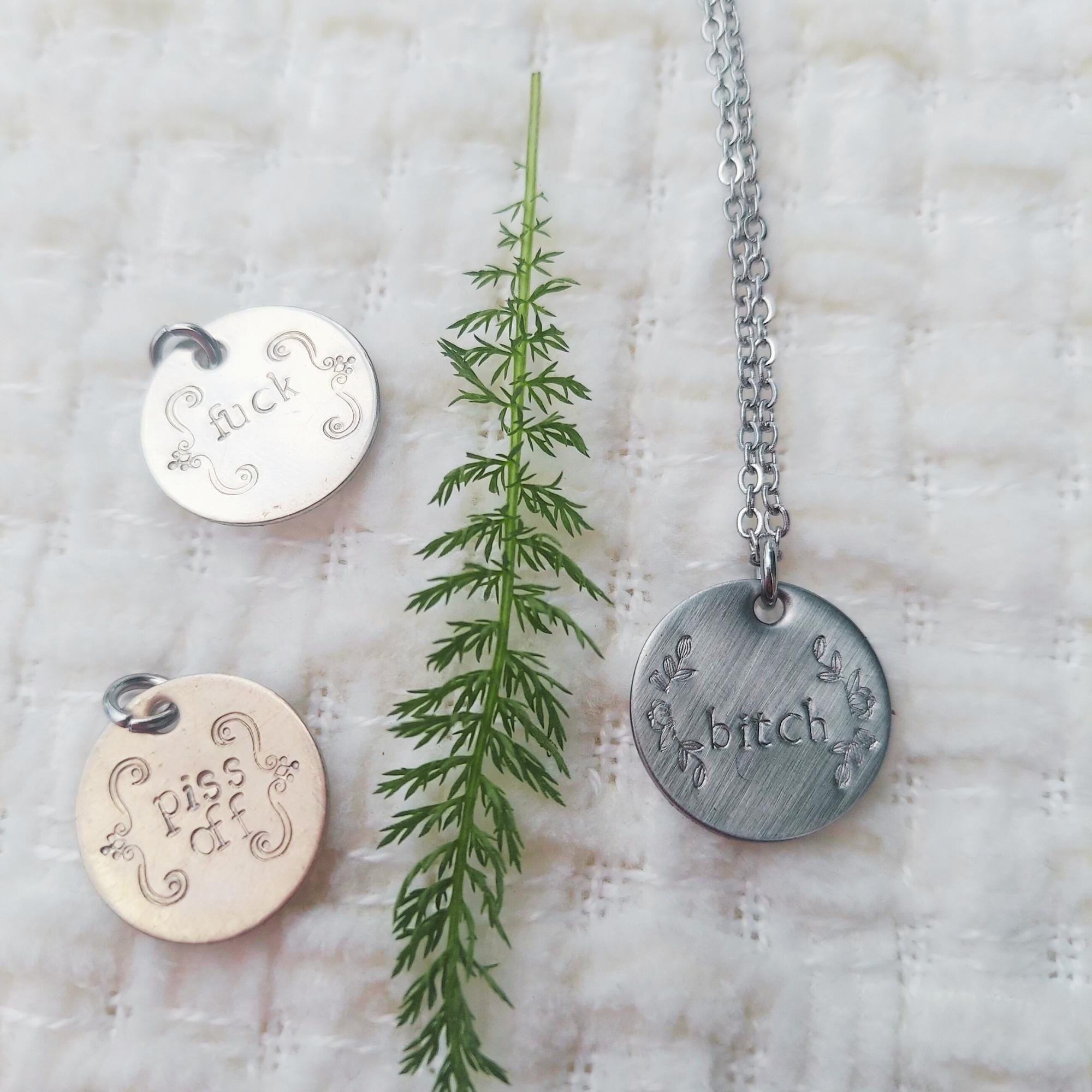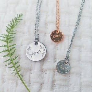 - silver pretty bitch= sterling silver disk, hand stamped with "bitch" and a floral filigree detail
