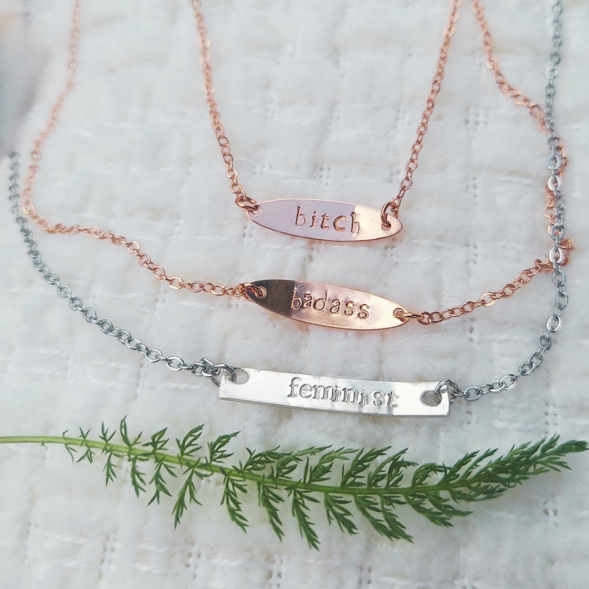 - silver feminist= sterling silver rectangle, hand stamped with "feminist"