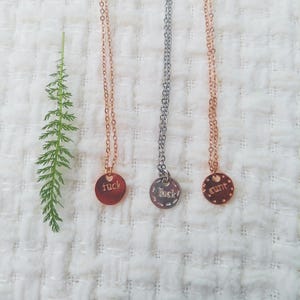 - rose plain fuck= tiny rose gold disk, hand stamped with "fuck"