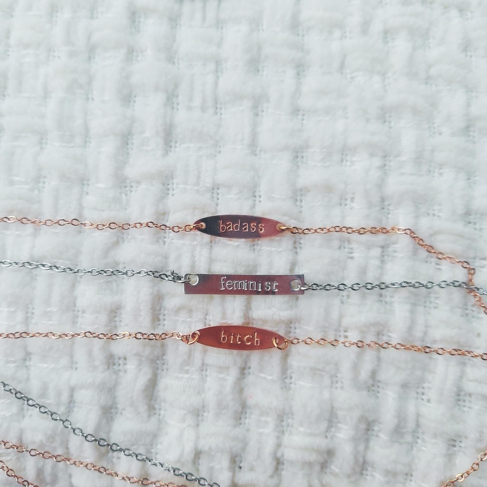 - silver feminist= sterling silver rectangle, hand stamped with "feminist"