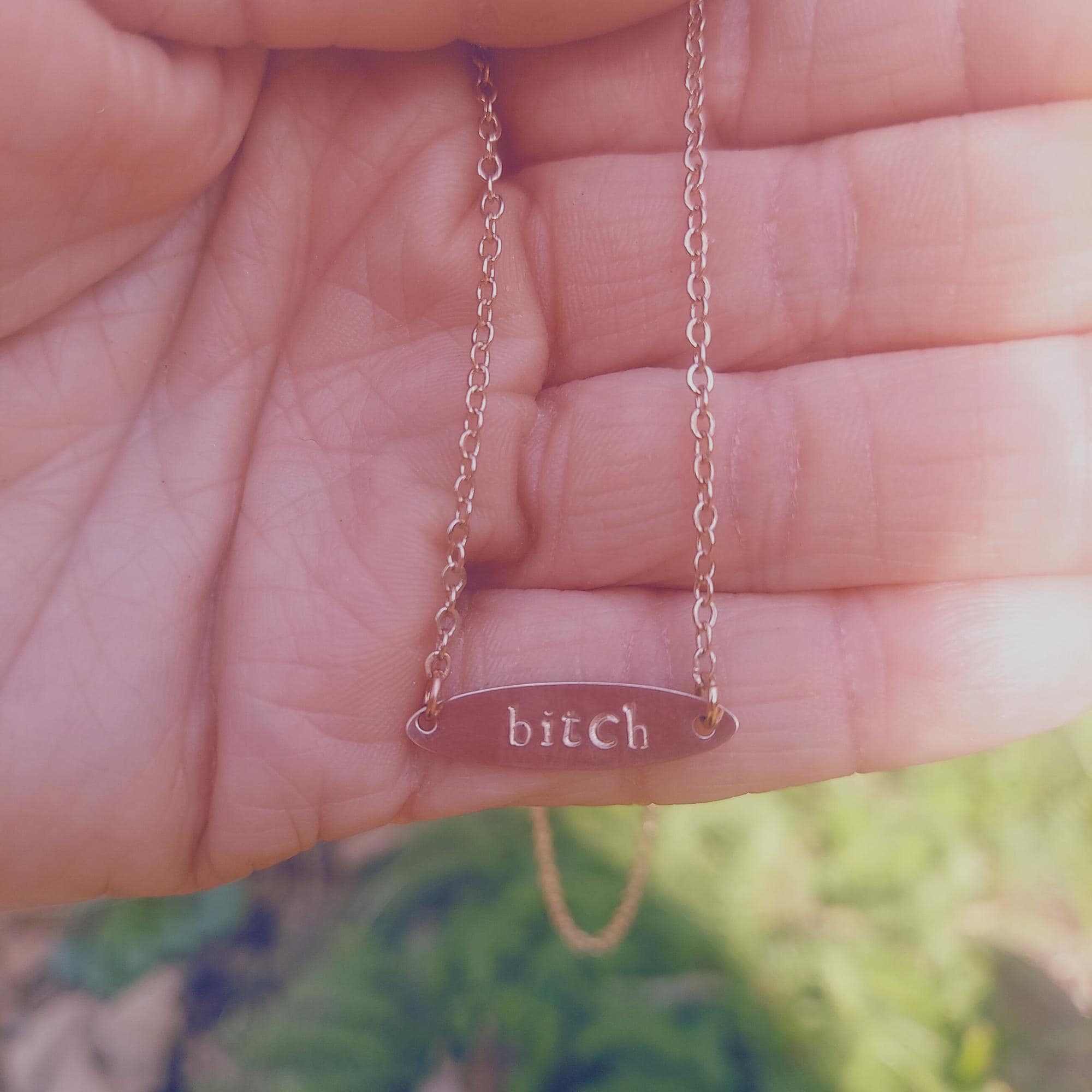 - rose oval bitch= rose gold oval, hand stamped with "bitch"